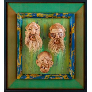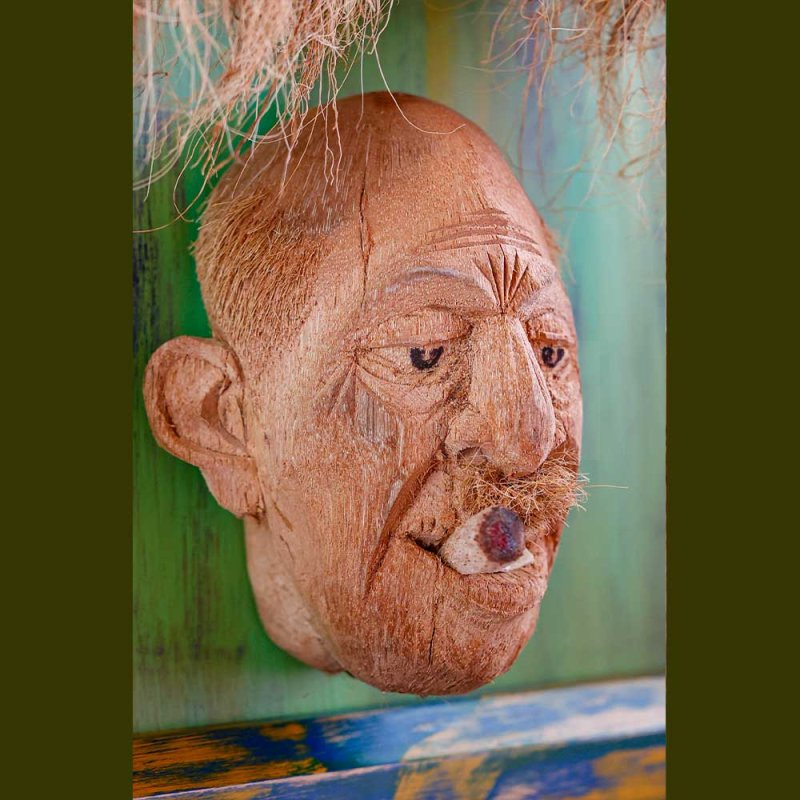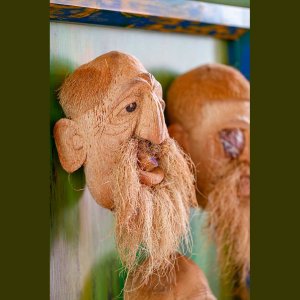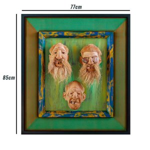 3 coconut figurines. Frame Size -77cm×85cm. Size of a single mask (Approx.) - 10cm×17cm.