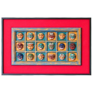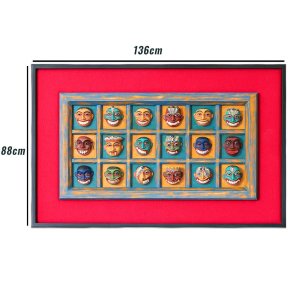 18 whimsical masks representing the entire Demon Series ( Daha Ata sanniya). Frame Size -136cm×88cm. Size of a single mask (Approx.) - 10cm×10cm.