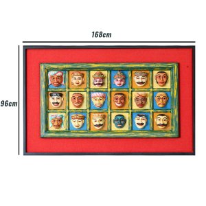 18 harmonious masks which exemplify the traditional dancers (kolam sanniya). Frame Size - 168cm×96cm. Size of a single mask (Approx.) - 12cm×12cm.